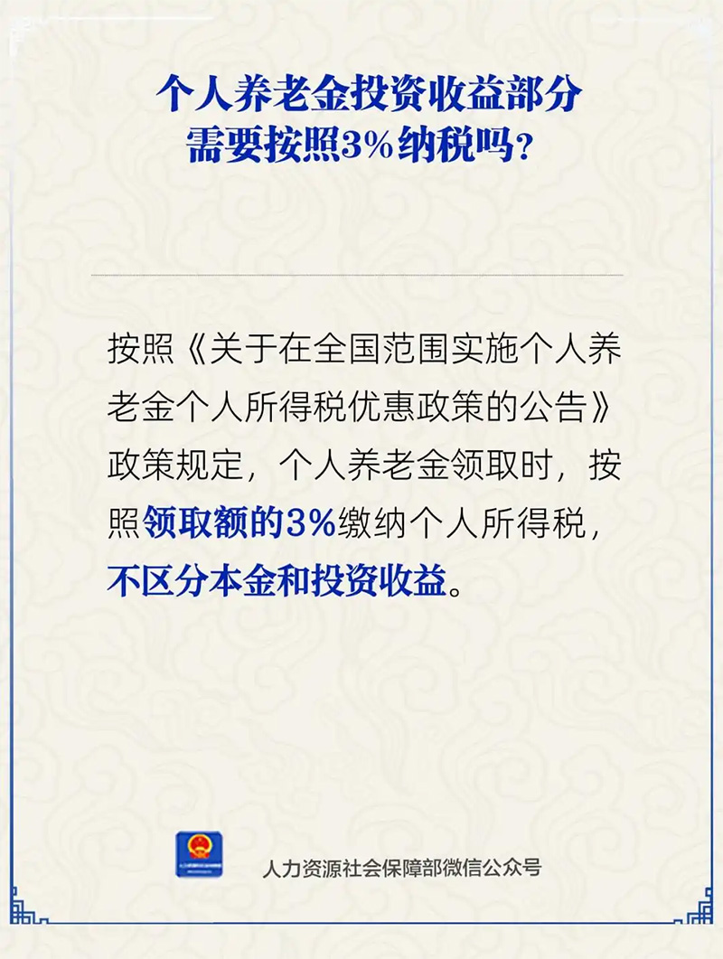 個人養(yǎng)老金投資收益部分需要按照3%納稅嗎?人社部24日通過官方微信公眾號作出解答。